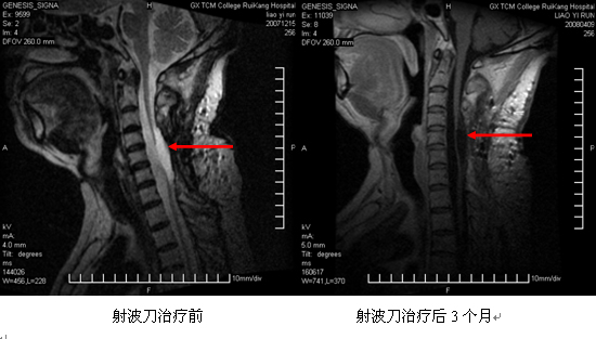 射波刀治疗颈4~6髓内神经纤维瘤病例:男,56岁,因四肢麻木、行走不稳20余年入院。患者20多年来因颈椎髓内神经纤维瘤行5次手术切除治疗,但症状一直反复发作。近一个多月以来患者四肢无力,不能起床,不能独自站立,生活不能自理,复查颈椎MRI提示:颈4~6髓内神经纤维瘤,脊髓明显受压。患者因反复5次手术,对施行第6次手术有恐惧感,故要求行射波刀治疗。患者在我院射波刀中心行5次治疗(每次约1小时,每天1次,连续5天),治疗后患者能自行起床,能自行进食,不需扶助下站立半小时,于治疗后第3天出院。出院后患者症状随时间推移而进行性改善,射波刀治疗后2个多月,患者能生活自理,能独立行走,四肢麻木明显减轻。射波刀治疗后3个月,回院复查MRI提示:颈4~6神经纤维瘤消失,局部囊性变。但患者因脊髓受压明显,嘱其加强功能锻炼以期促进康复。